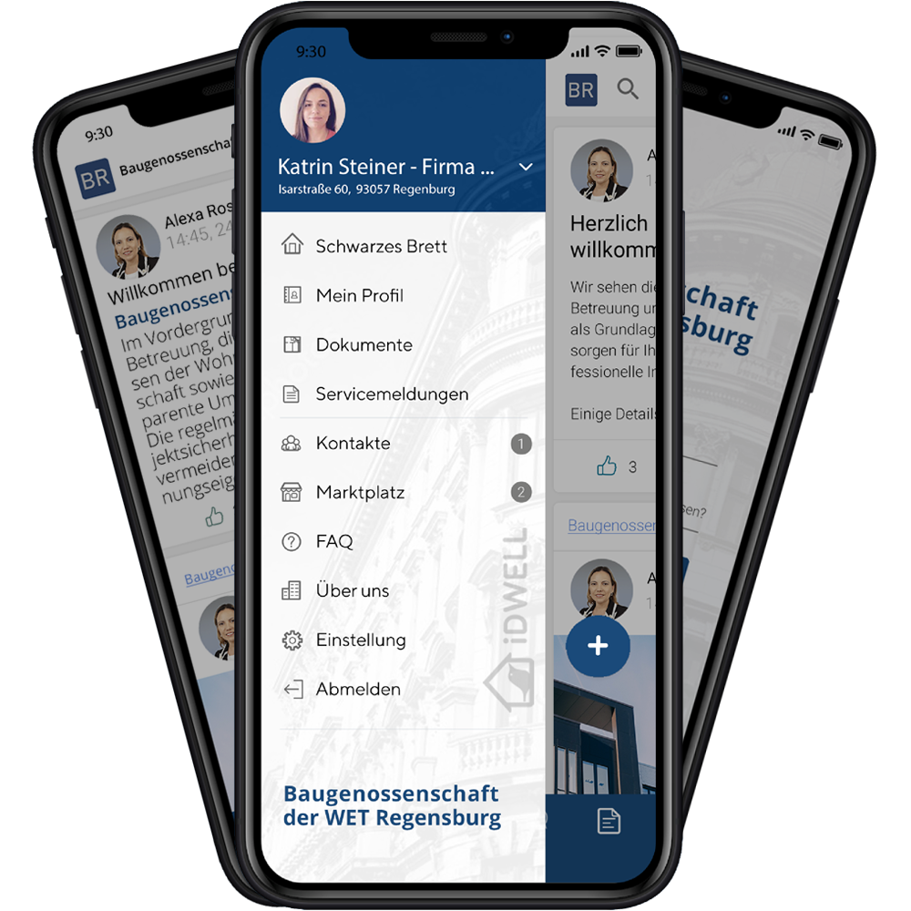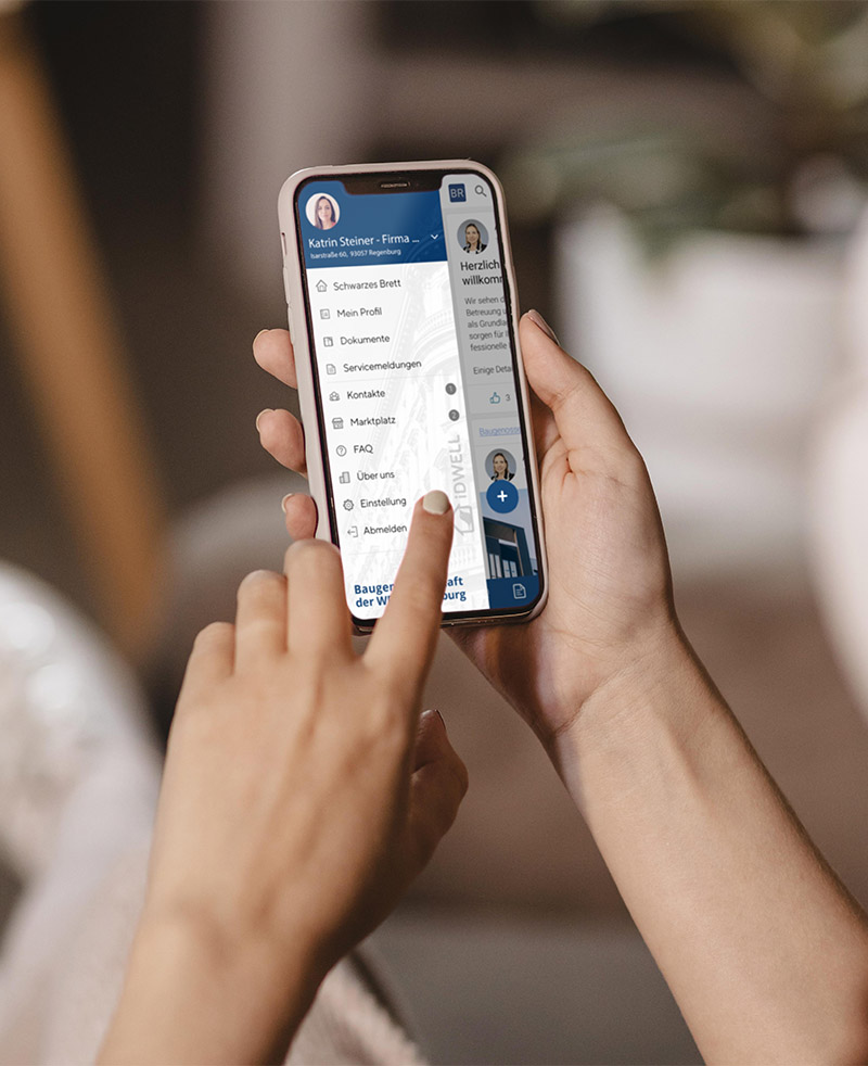 Stehen im Fokus. Informieren Sie sich zu jeder Zeit und an jedem Ort rund um Ihre Immobilie auf der BauG-Isar App powered by iDWELL.
