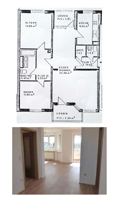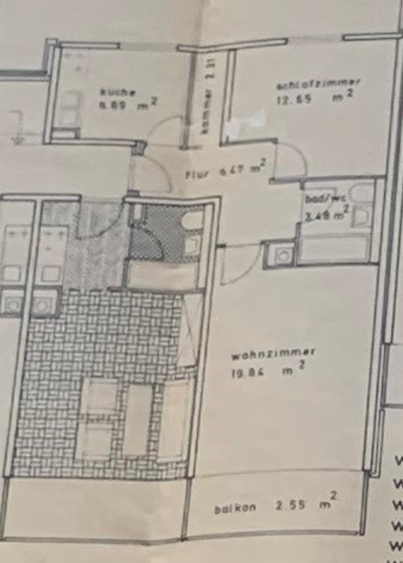 Größe: 3-Zimmer-Appartement, 84,55 m², Küche, Bad m. Badewanne, WC, Abstellkammer, Dielen, 2 Balkone (Nord und Süd), Kellerabteil, (Fußböden vo 3 Jahren erneuert; Küche, Bad, WC nicht renoviert)